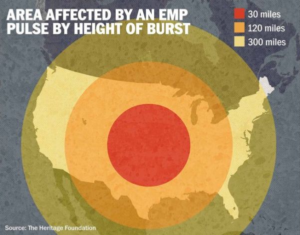 This image from The Heritage Foundation depicts the area of destruction that would be caused by an EMP blast detonated at various altitudes.